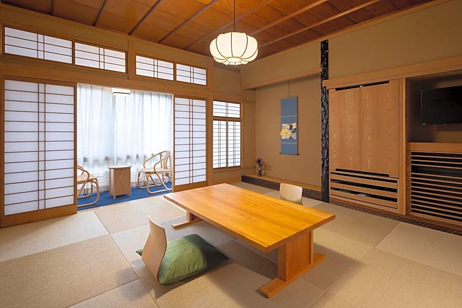 The quadruple room features a private bathroom, air conditioning, tatami, as well as a seating area with a flat-screen TV. The quadruple room provides a safe deposit box, an electric kettle, yukata, heating and a TV. The unit offers 4 futons.
